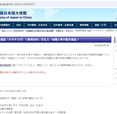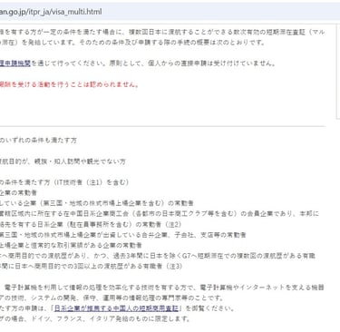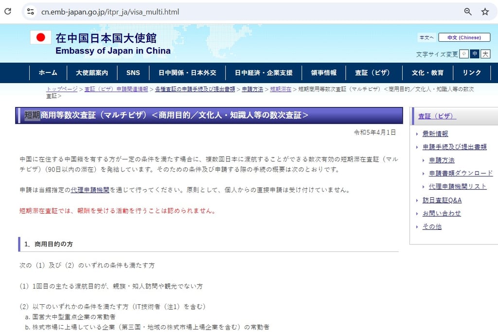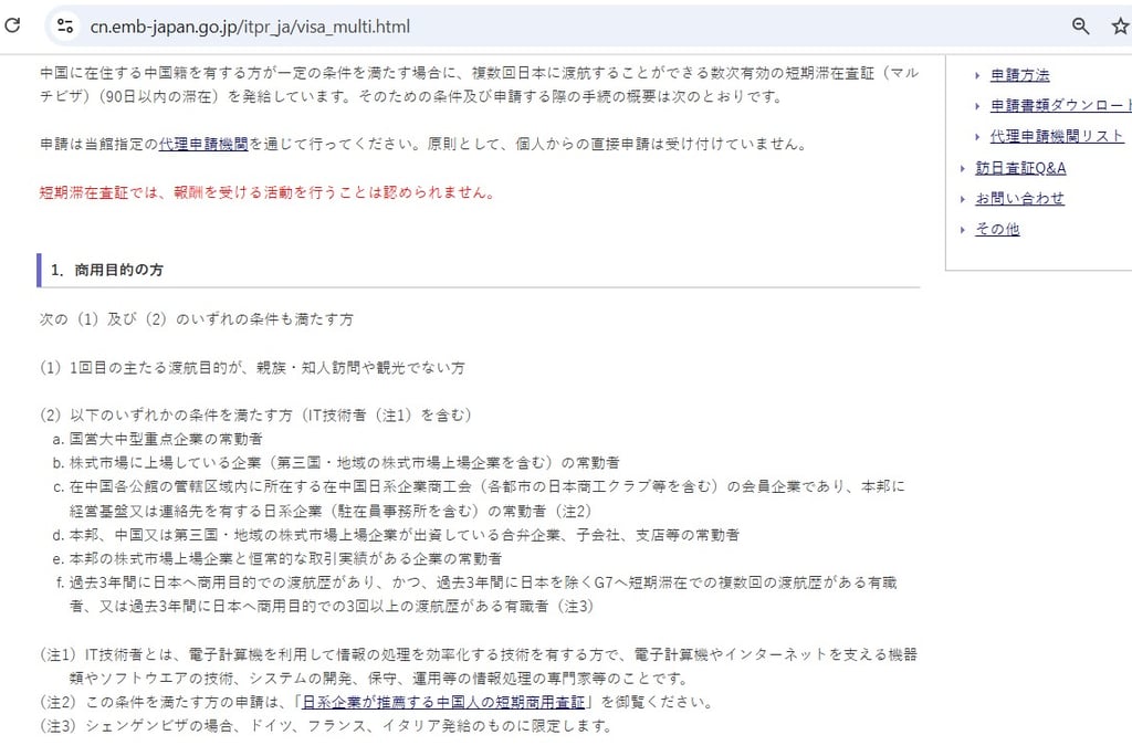 例えば、2-Fの規定では、日本大使館は「過去3年間にビジネスビザで3回以上日本を訪問した申請者」に対して数次ビジネスビザの申請資格があると記載しています。しかし、日本大使館の中国人職員は旅行代理店に対して、私のようなケースは該当しないと伝えています。理由として、私は数次ビジネスビザを利用して日本を訪問しており、たとえ100回訪問していてもカウントされないとのことです。彼らの説明では、3回の訪問はそれぞれ単次ビザでの訪問でなければならないとされています。