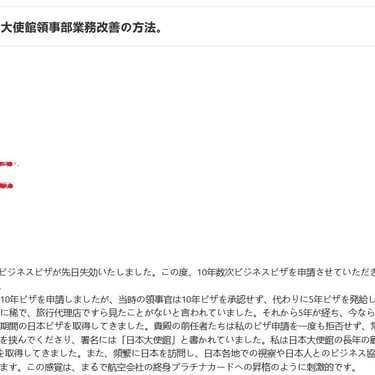 「中国の大使館も日本人に対して同様の対応をしているかもしれない」といった比較は必要ありません。今は投資と知的資源を争う時代であることを忘れてはいけません。大使館は日本全体と企業を代表してビジネスを行い、ビザ申請者と関わる存在です。もし中国が投資や知的資源を必要としないのであれば、それは中国の問題です。しかし、他国と間違いの多さを比較するのではなく、正しい対応をどれだけ実行できるかを基準にすべきです。