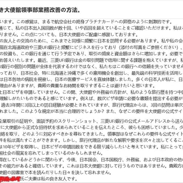 もちろん、日本大使館が中国人申請者に対して厳しい要求をするのは、日本国民を守るためであることは理解しています。私は日本国民を守ることを強く支持しています。しかし、その方法や、すでに制御が効かなくなっているように見える中国人職員の対応は、多くの善良な中国人を傷つける結果となっており、また大使館の業務効率の低下にもつながっています。